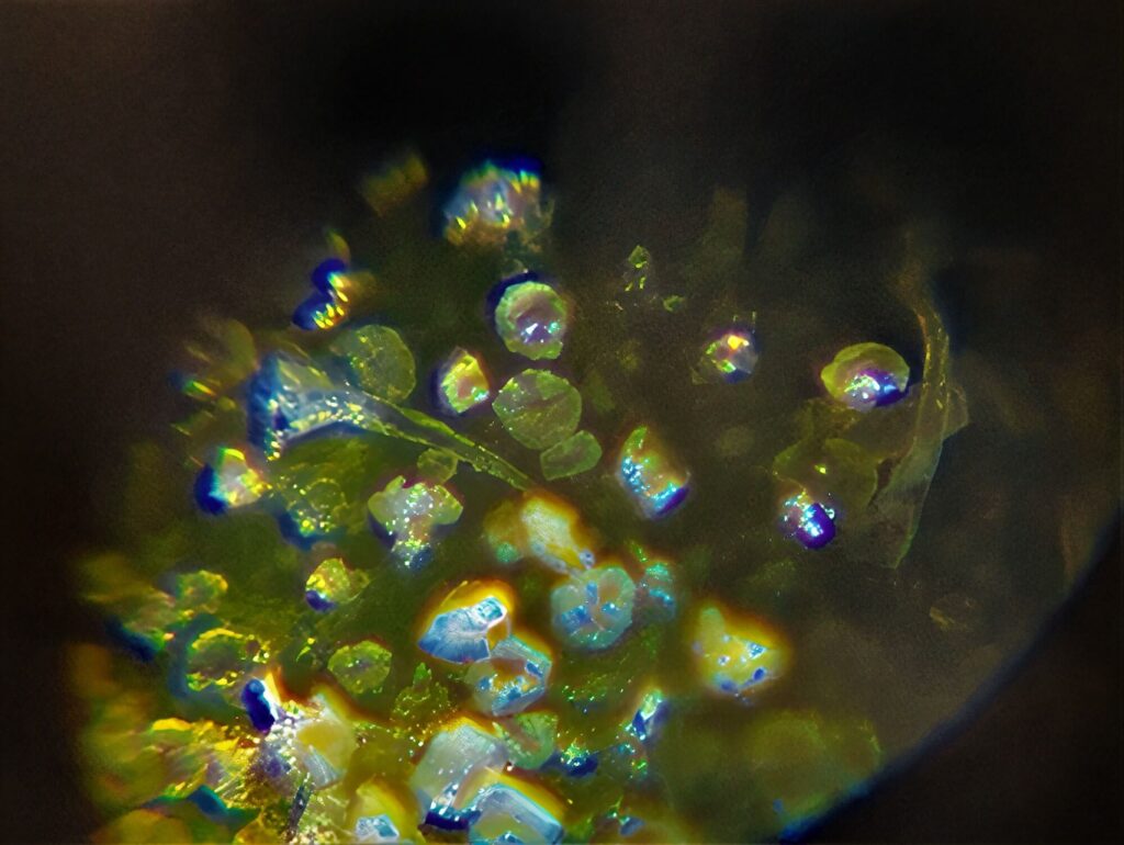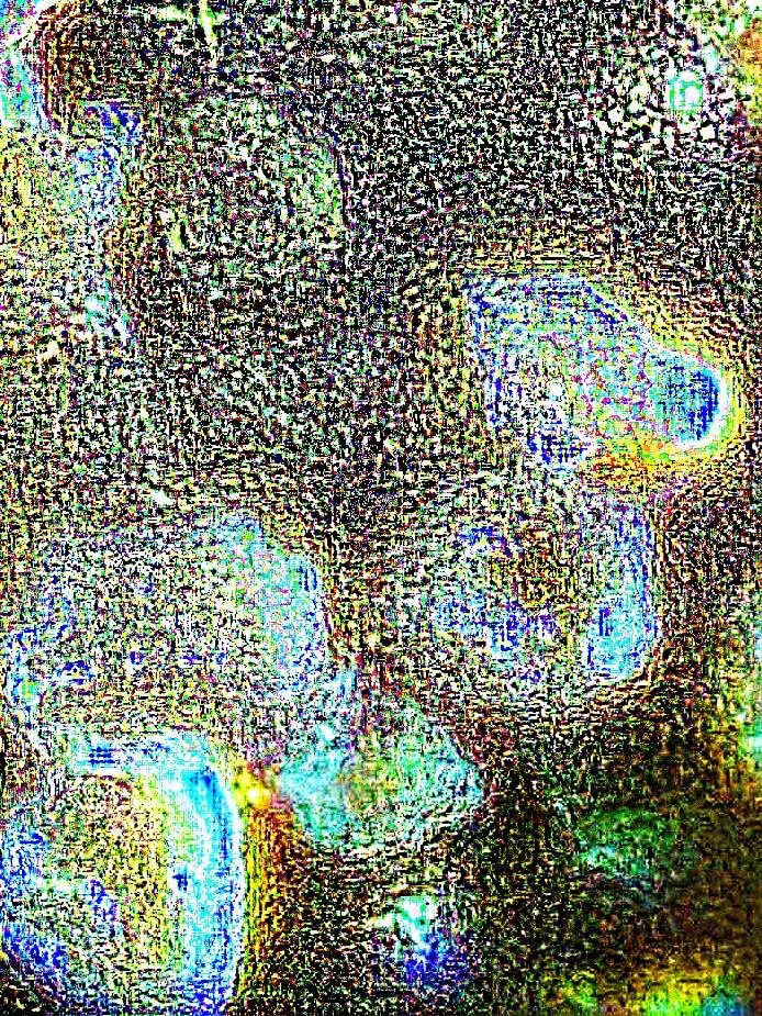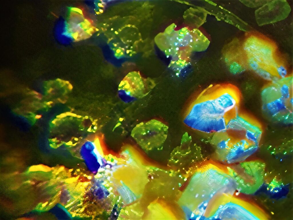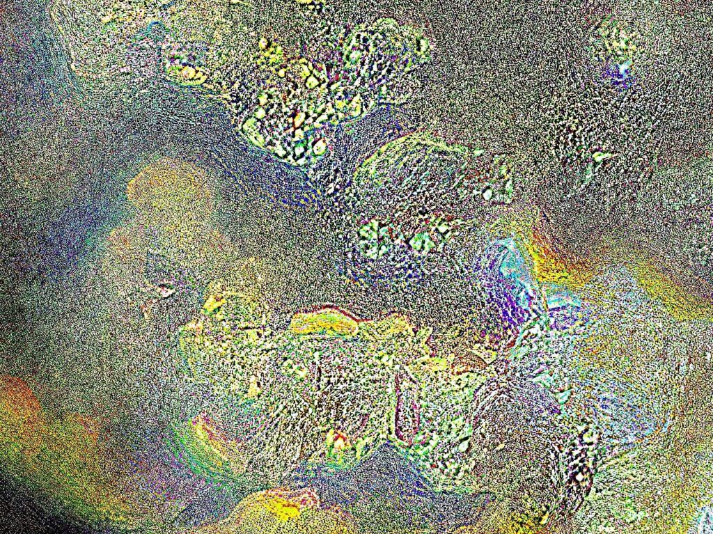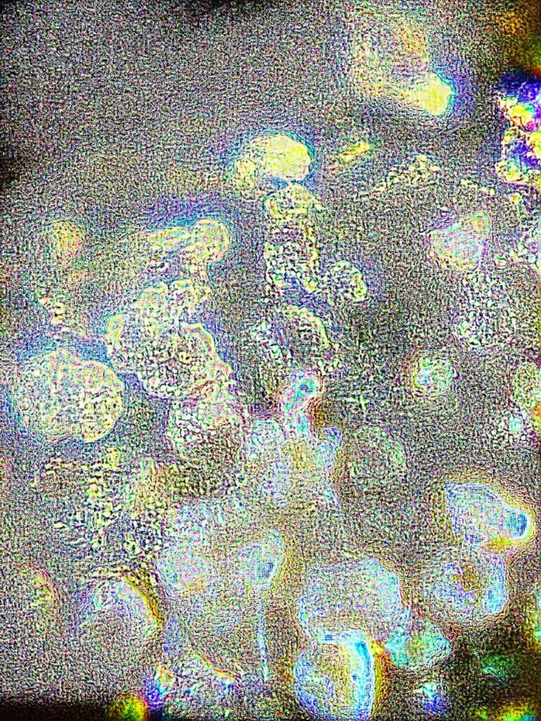„Mikroszkóp lencséjéről készült képek, melyek alatt különböző kristályos szerkezetű anyagok vannak. Az első három kép azt a folyamatot mutatja be, hogyan változik meg a kép pixel enhancer-t használva. Jelen esetben a letsenhance.io-t. A 4. képnél ebből a sorozatból használtam Photoshop-ot is, kíváncsi voltam milyen hatást kelt, ha a már “enhance-d” képet intelligens élesítés alá vetem. Ebből kivágtam olyan kisebb részleteket amik számomra érdekes vizuális élményt adtak (5-6-7-es képek).